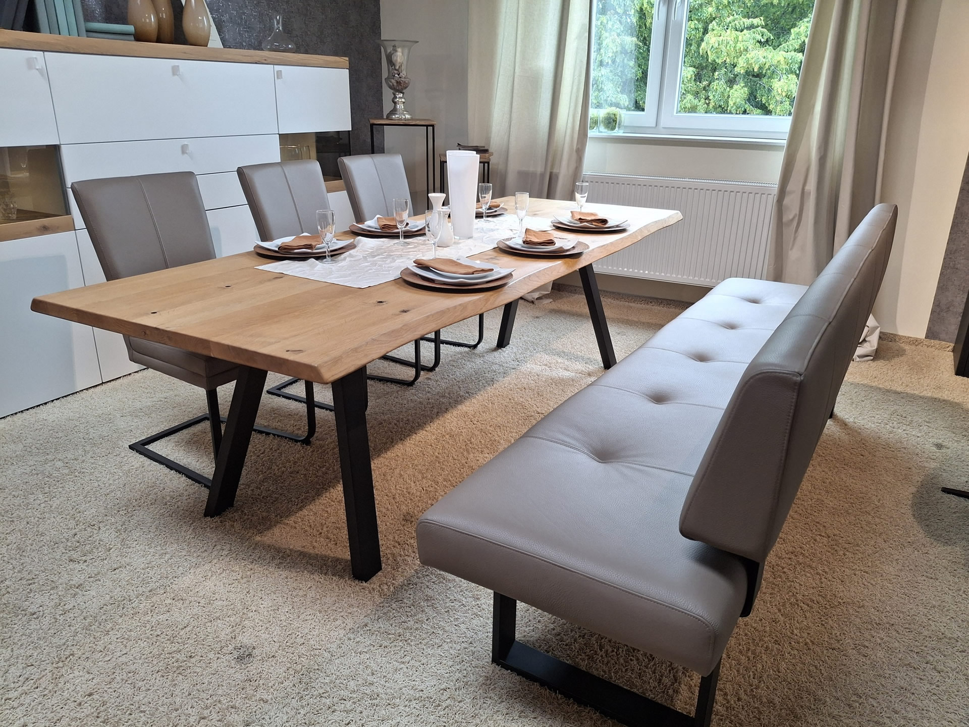 Hochwertige Essgruppe bestehend aus einem Esstisch in Eiche massiv lackiert in Soft-Touch mit Epoxidharz hellgrau mittig mit einem schwarzen Kreuzfuß im Maß 240 x 100 cm, 3 Sessel in Büffelleder mocca und einer Bank in Büffelleder mocca im Maß 200 cm zu einem reduziertem Preis. Abholpreis ab Geseke-Langeneicke. Eine Lieferung im Umkreis von 50 km ist gegen einen Mehrpreis möglich.